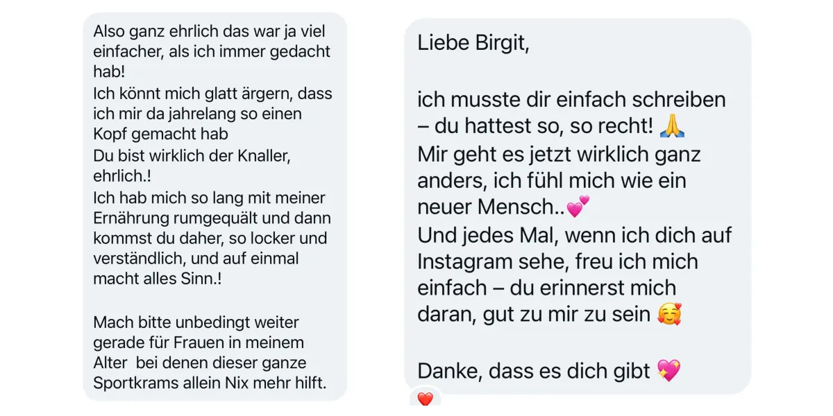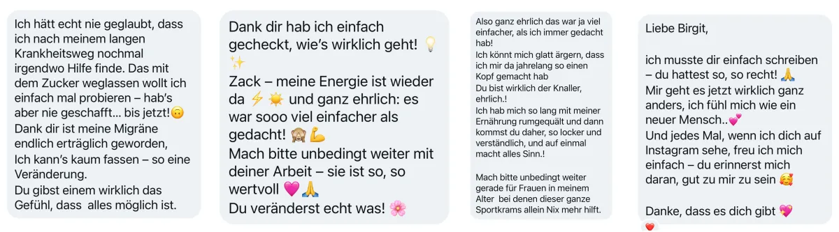 Dank der 3 Phasen Methode bin ich endlich meine Heißhungerattacken los geworden. Danke liebe Birgit!! Das hätte ich ja niemals gedacht. Jetzt schon 4,5 Kilo abgenommen.